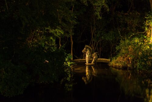 Horse sculpture located in the art and nature forest at Diyabubula. This image taken at the night has captured the water, greenery of the forest and the beautiful golden sculpture