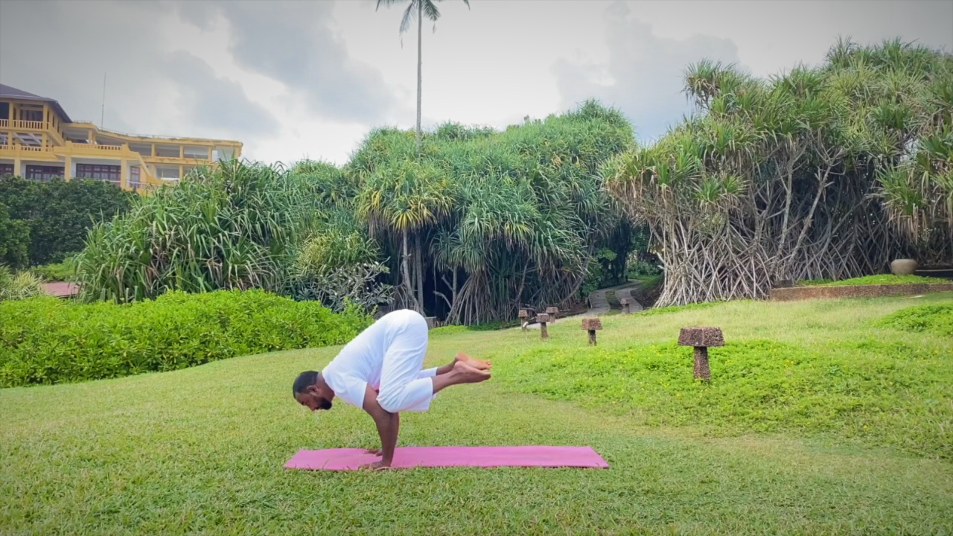 Yoga Teacher Demonstrating Crow Pose on the garden and forest behind